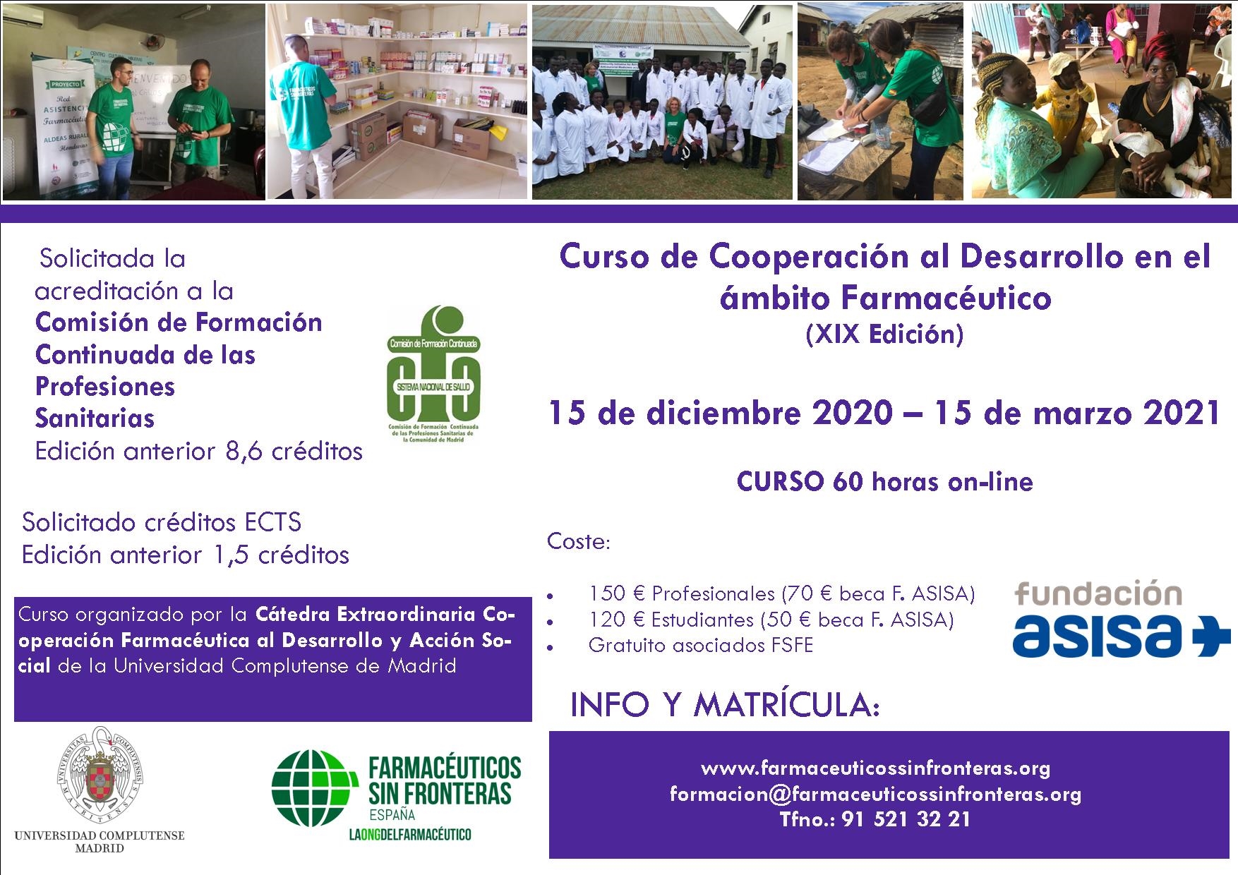 Tendrá lugar del 15 de diciembre del 2020 al 15 de marzo 2021, dentro del programa de Formación de Proyecto Boticarios para la profesionalización en Cooperación Farmacéutica . Curso de 60 horas on line.